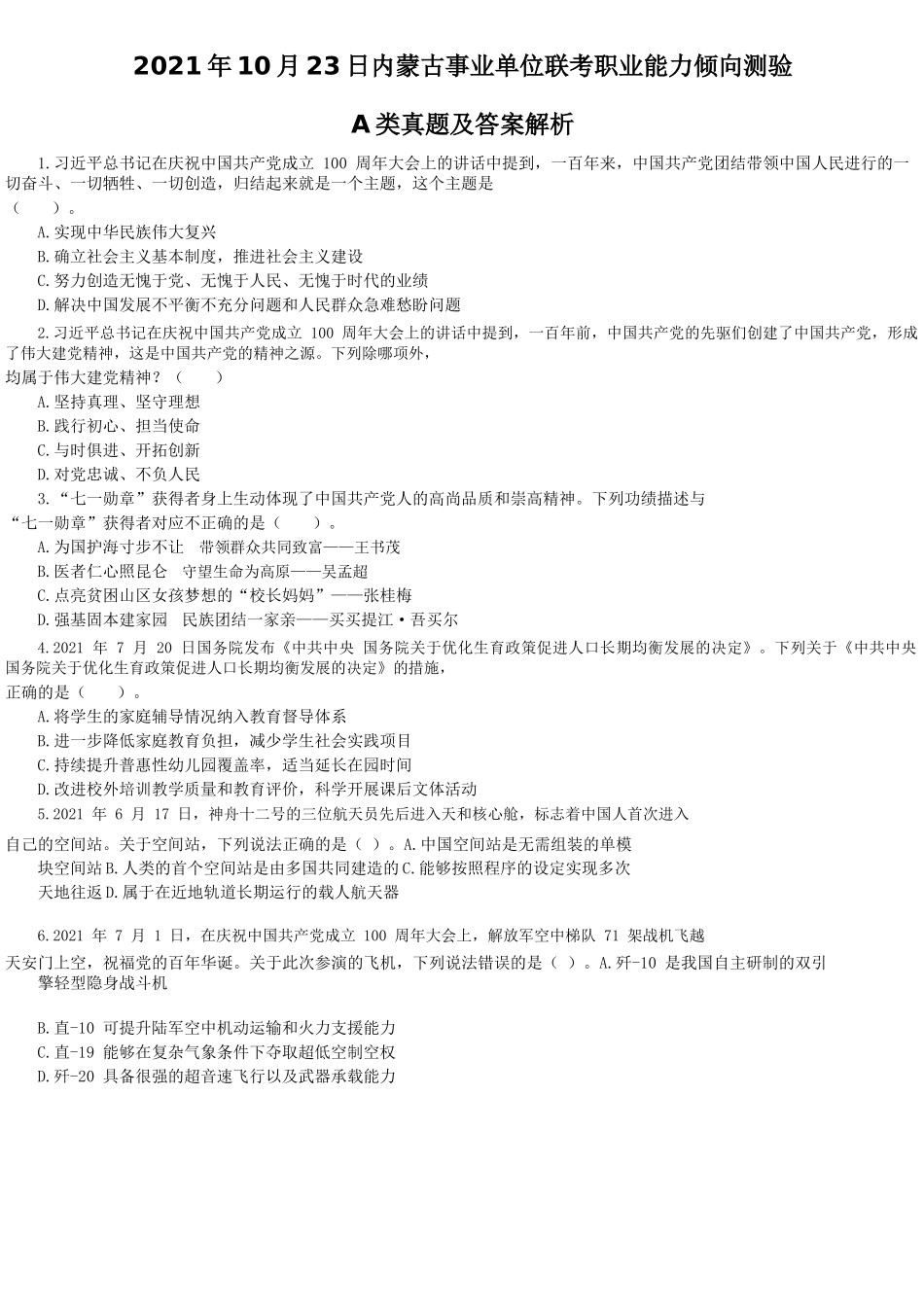 2021年10月23日内蒙古事业单位联考职业能力倾向测验A类真题及答案解析1.习近平总书记在庆祝中国共产党成立100周年大会上的讲话中提到,一百年来,中国共产党团结带领中国人民进行的一切奋斗、一切牺牲、一切创造...