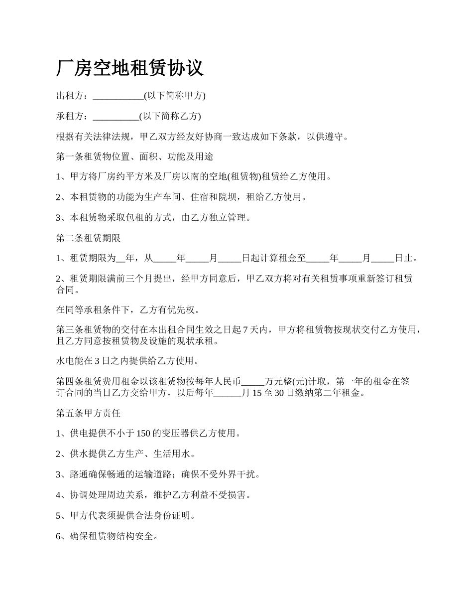 厂房空地租赁协议