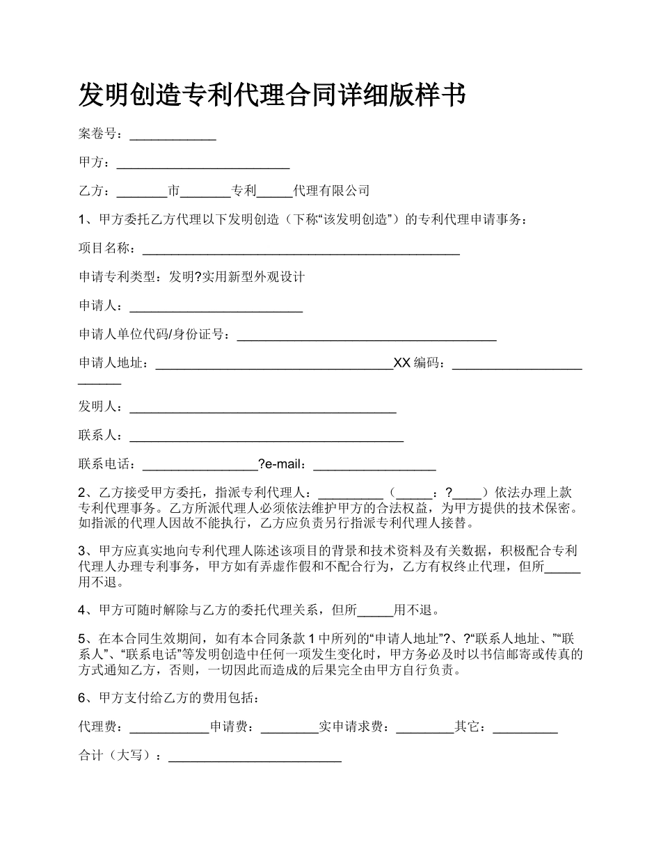 发明创造专利代理合同详细版样书案卷号:____________甲方:________________________乙方:_______市_______专利_____代理有限公司1、甲方委托乙方代理以下发明创造(下称“该发明创造”)的专利代理申请事务:...