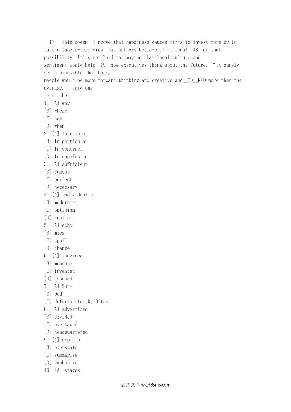 2016广西考研英语二真题及答案Section1UseofEnglishDirections:Readthefollowingtext.Choosethebestword(s)foreachnumberedblankandmark[A],[B],[C]or[D]onANSWERSHEET1.(10points)Happypeopleworkdifferently.Th...