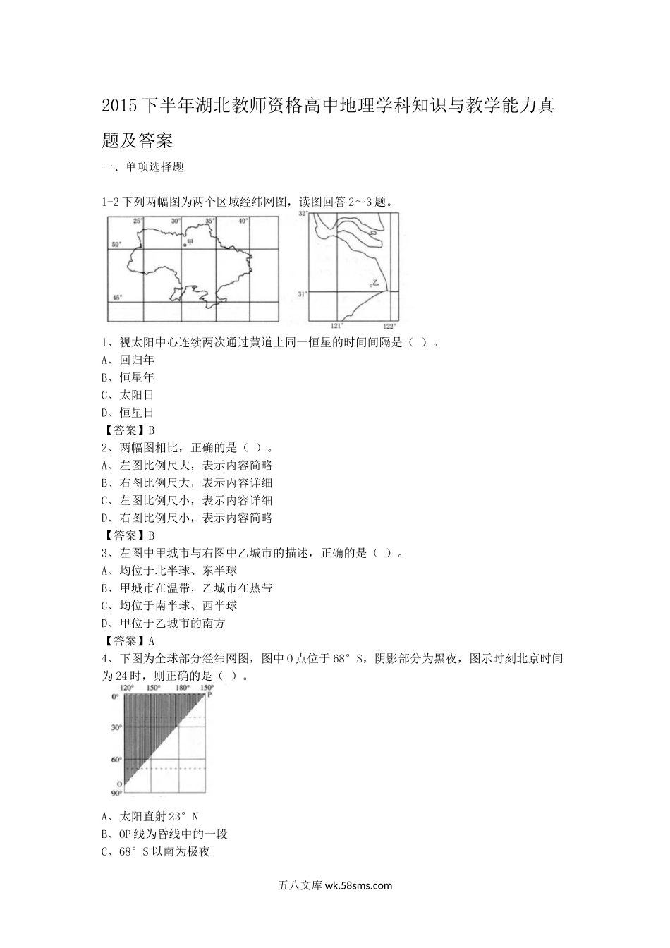 2015下半年湖北教师资格高中地理学科知识与教学能力真题及答案一、单项选择题1-2下列两幅图为两个区域经纬网图,读图回答2~3题。1、视太阳中心连续两次通过黄道上同一恒星的时间间隔是()。A、回归年B、恒星年C...