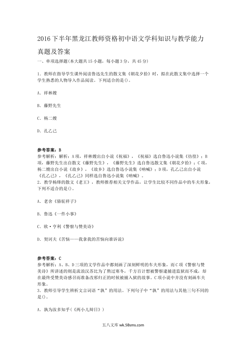 2016下半年黑龙江教师资格初中语文学科知识与教学能力真题及答案.doc