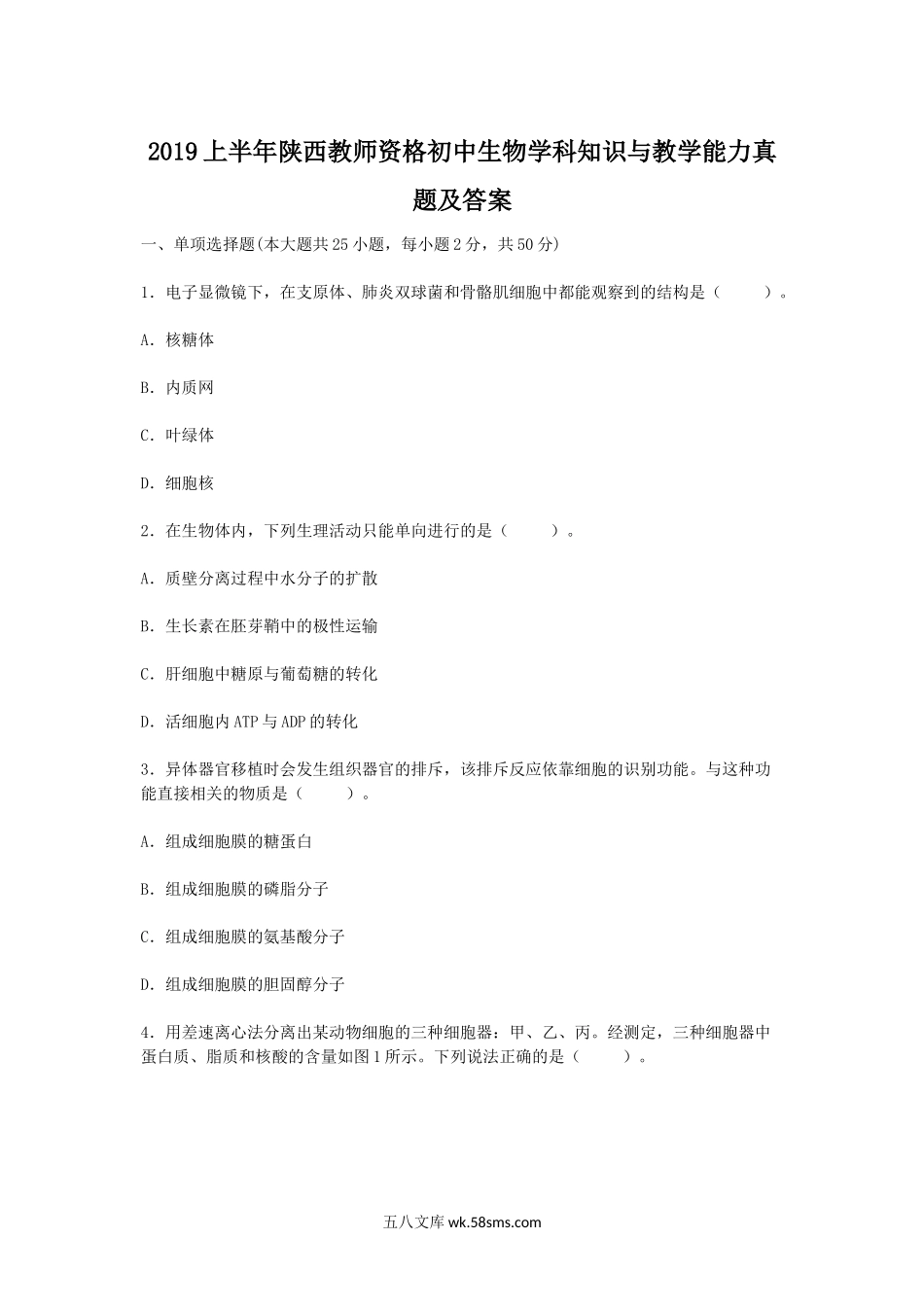 2019上半年陕西教师资格初中生物学科知识与教学能力真题及答案.doc_第1页