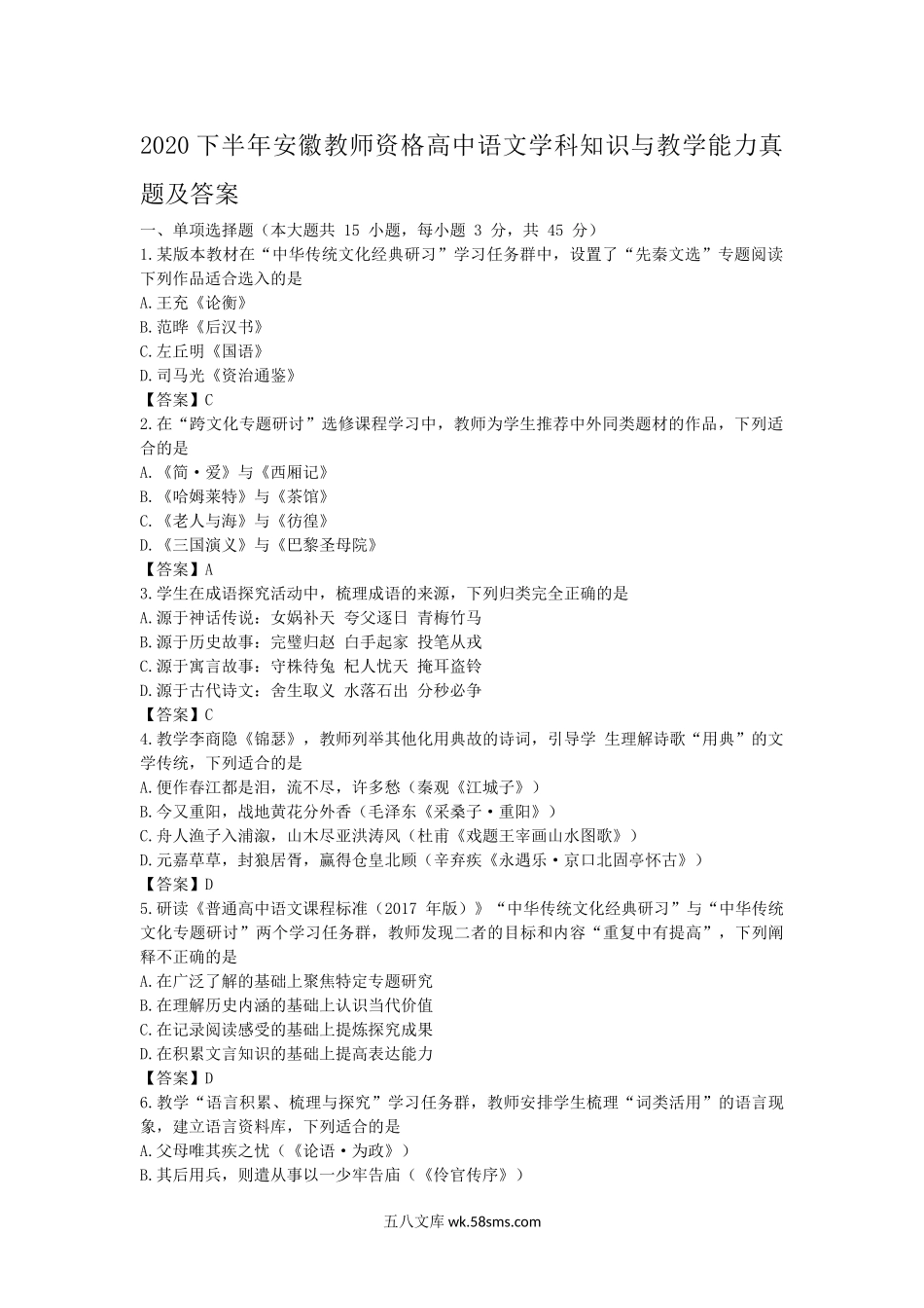 2020下半年安徽教师资格高中语文学科知识与教学能力真题及答案.doc