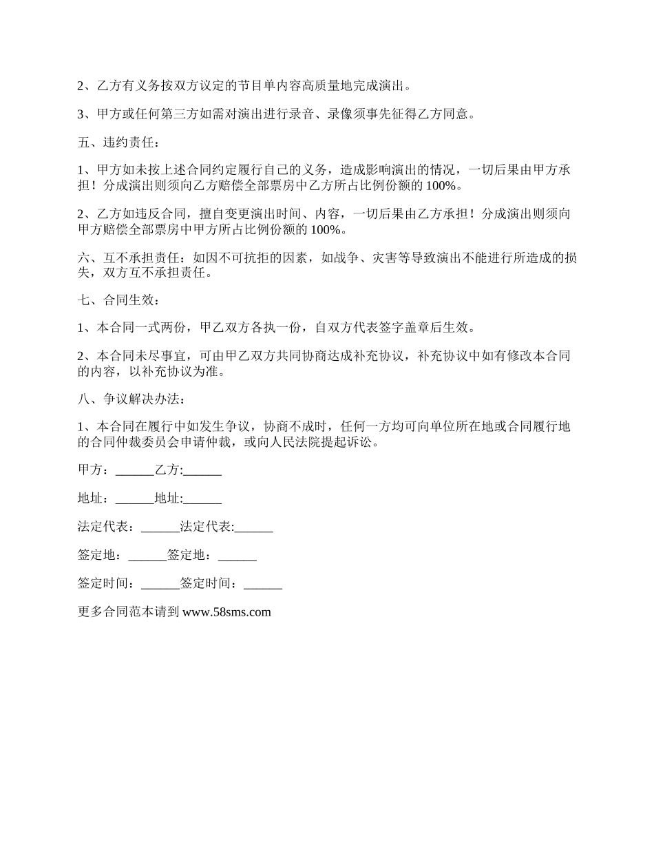 商业演出活动合同书现甲乙双方就乙方应邀演出相关事宜签订以下协议:一、演出内容、时间、地点、场次:1、甲乙双方经过相互协商,决定举办______演出2、演出时间定于:3、演出地点:4、演出场次:5、演出装台、排...