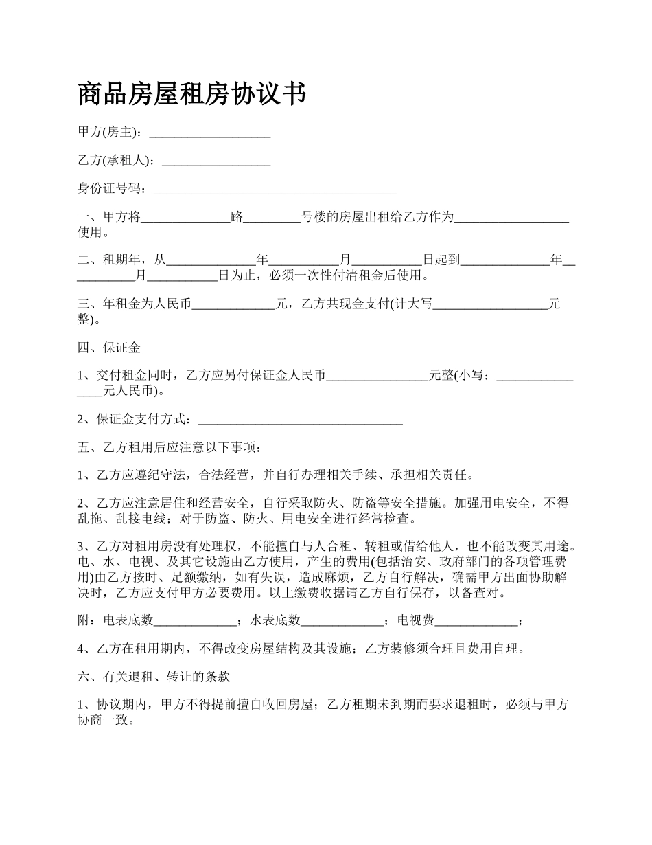 商品房屋租房协议书甲方(房主):___________________乙方(承租人):_________________身份证号码:______________________________________一、甲方将______________路_________号楼的房屋出租给乙方作为________...