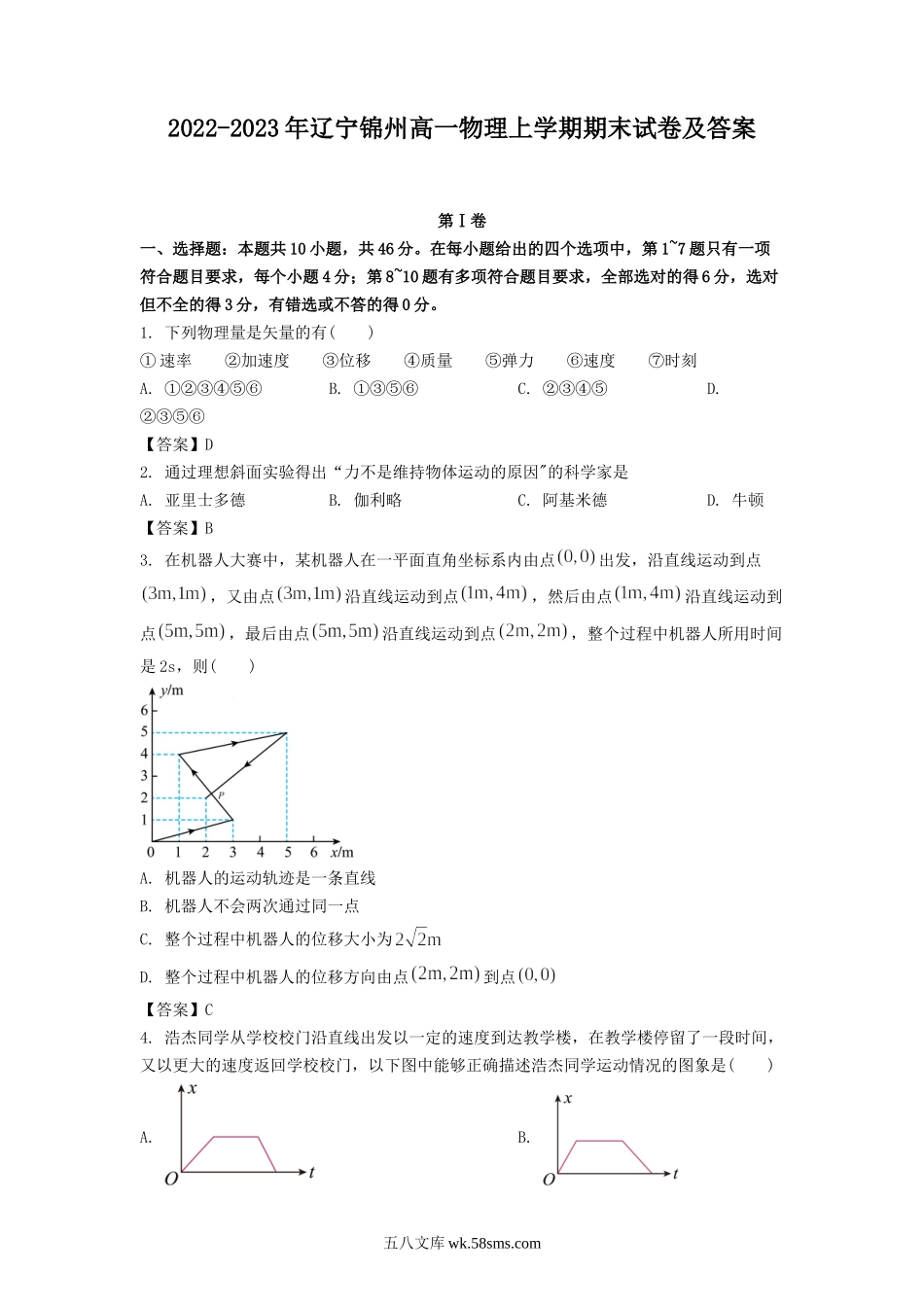 2022-2023年辽宁锦州高一物理上学期期末试卷及答案第Ⅰ卷一、选择题:本题共10小题,共46分。在每小题给出的四个选项中,第1~7题只有一项符合题目要求,每个小题4分;第8~10题有多项符合题目要求,全部选对的得6...