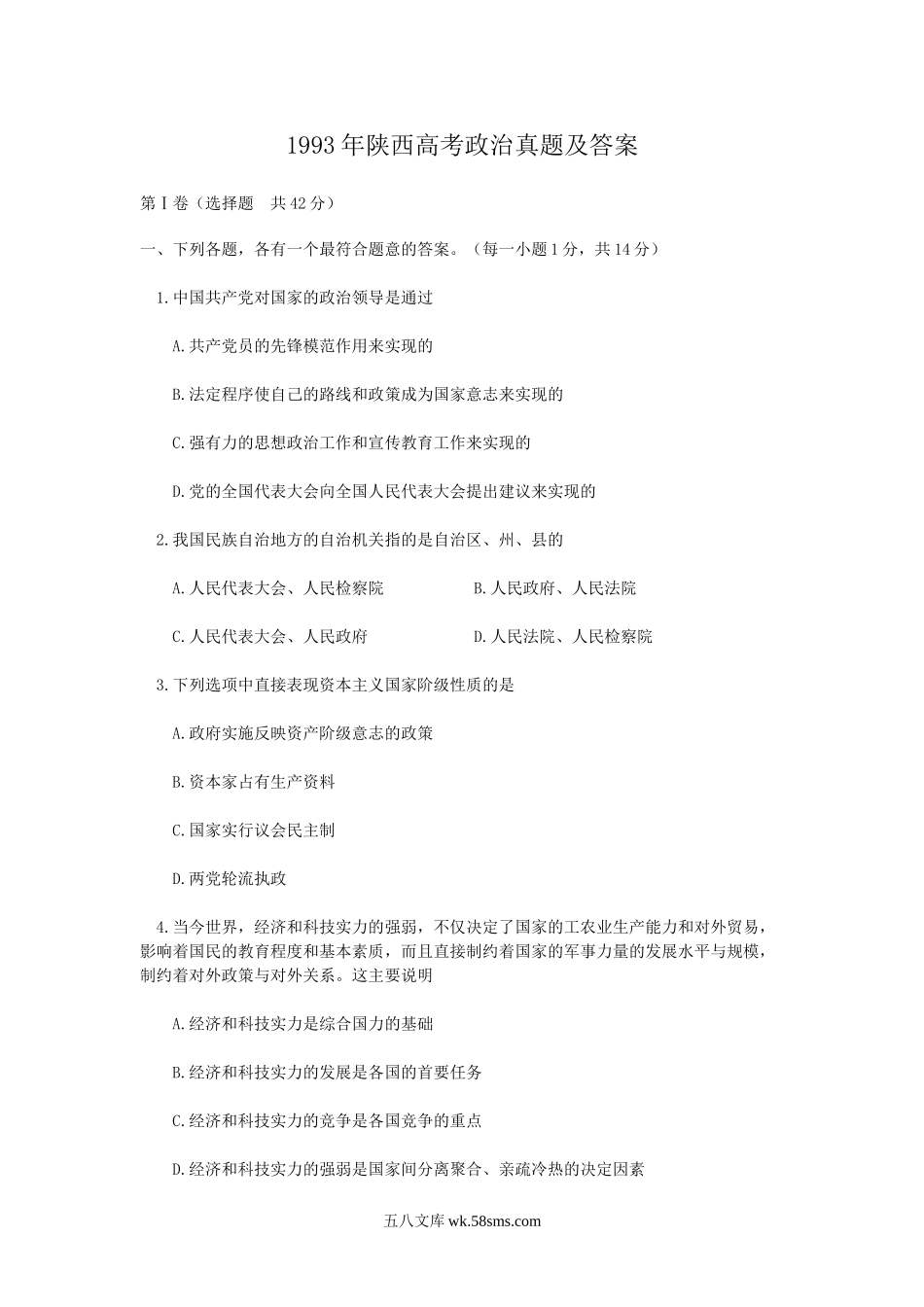 1993年陕西高考政治真题及答案第Ⅰ卷(选择题共42分)一、下列各题,各有一个最符合题意的答案。(每一小题1分,共14分)1.中国共产党对国家的政治领导是通过A.共产党员的先锋模范作用来实现的B.法定程序使自己的...