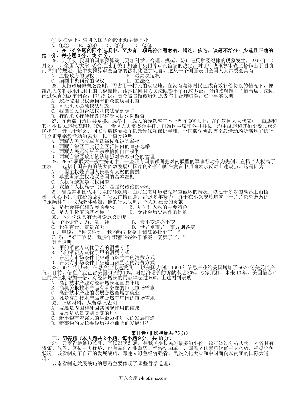 2000年广东高考政治真题及答案第Ⅰ卷(选择题共75分)一、在下列各题的四个选项中,只有一项是最符合题意的。每小题2分,共48分。1.1999年9月22日,中共十五届四中全会通过的《中共中央关于国有企业改革和发展若...