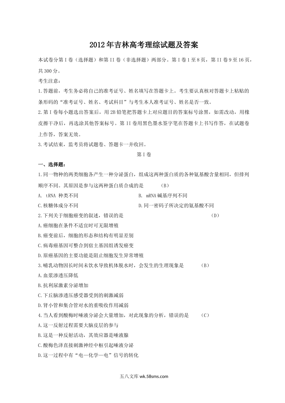 2012年吉林高考理综试题及答案本试卷分第I卷(选择题)和第II卷(非选择题)两部分。第I卷1至8页,第II卷9至16页,共300分。考生注意:1.答题前,考生务必将自己的准考证号、姓名填写在答题卡上。考生要认真核对...