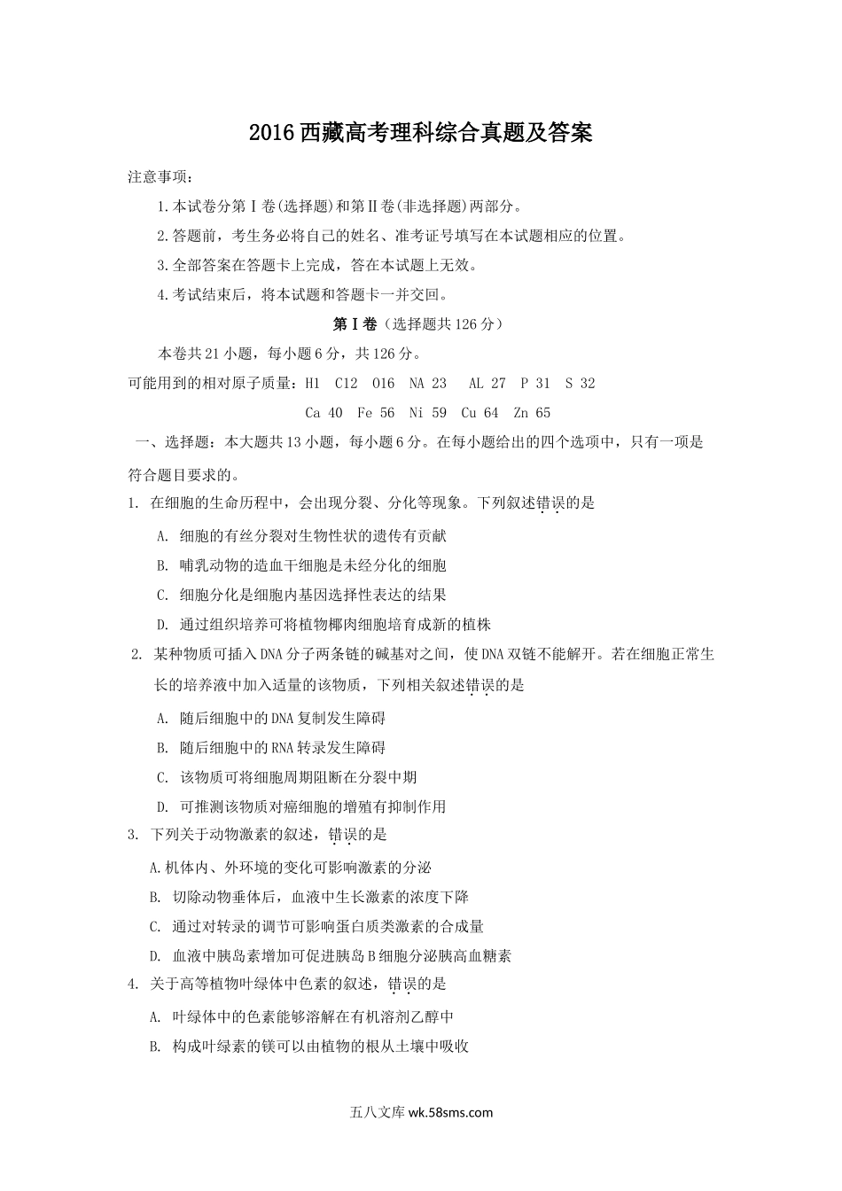 2016西藏高考理科综合真题及答案注意事项:1.本试卷分第Ⅰ卷(选择题)和第Ⅱ卷(非选择题)两部分。2.答题前,考生务必将自己的姓名、准考证号填写在本试题相应的位置。3.全部答案在答题卡上完成,答在本试题上无效...
