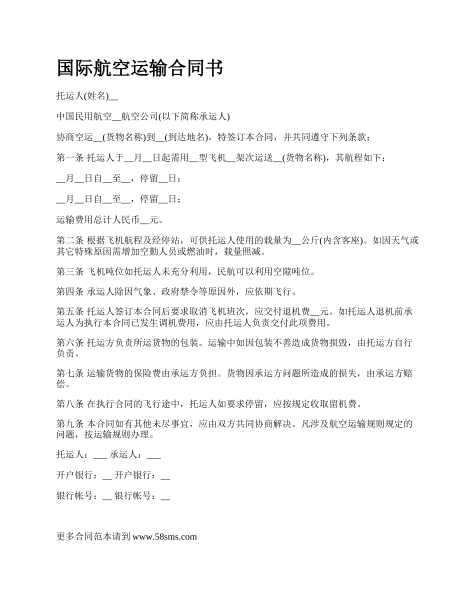 国际航空运输合同书托运人(姓名)__中国民用航空__航空公司(以下简称承运人)协商空运__(货物名称)到__(到达地名),特签订本合同,并共同遵守下列条款:第一条托运人于__月__日起需用__型飞机__架次运送__(货物名称...
