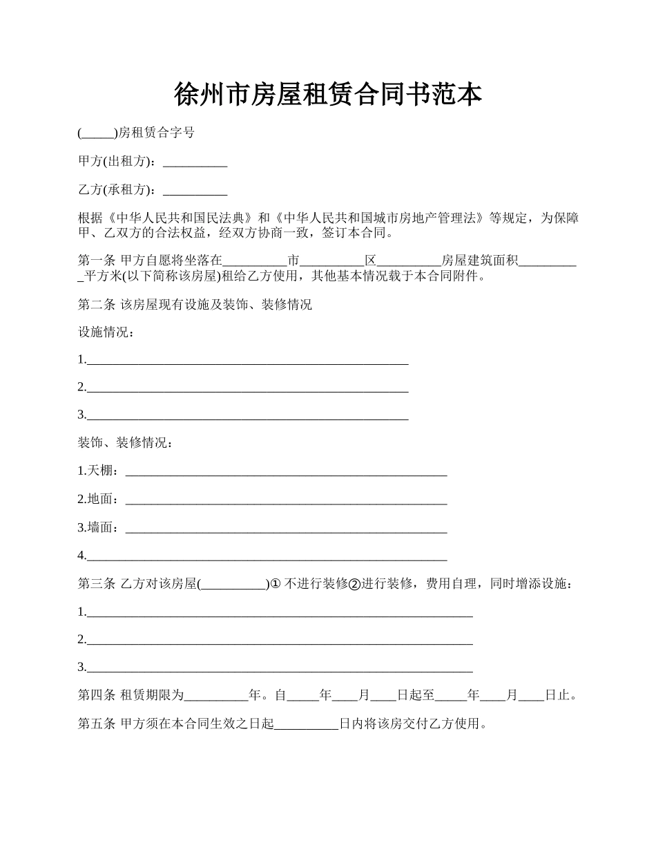 徐州市房屋租赁合同书范本(_____)房租赁合字号甲方(出租方):__________乙方(承租方):__________根据《中华人民共和国民法典》和《中华人民共和国城市房地产管理法》等规定,为保障甲、乙双方的合法权益,经双方...
