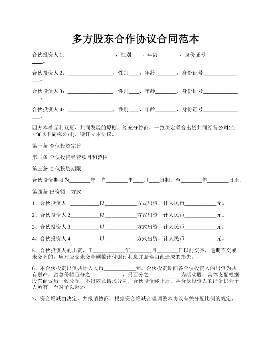 多方股东合作协议合同范本合伙投资人1:__________________,性别____,年龄________,身份证号________________。合伙投资人2:_________________,性别____,年龄________,身份证号________________。合伙投资...