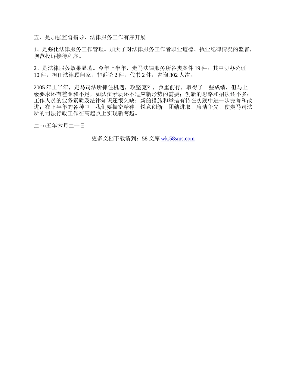 司法所半年工作总结工作总结2005年上半年,我所认真践行“三个代表”重要思想和科学发展观,全面贯彻依法治国基本方略,坚持抓基层、打基础,积极落实上级司法行政机关的工作部署,紧紧围绕“坚持高标准、全面上...