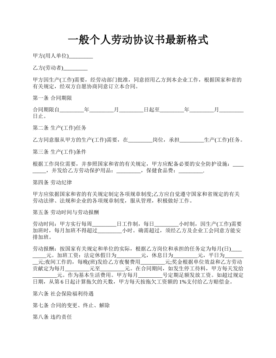 一般个人劳动协议书最新格式甲方(用人单位)_________乙方(劳动者)_________甲方因生产(工作)需要,经劳动部门批准,同意招用乙方到本企业工作,根据国家和省的有关规定,经双方自愿协商同意订立本合同。第一条合...