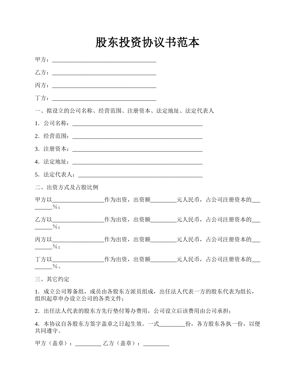 股东投资协议书范本甲方:____________________________________乙方:____________________________________丙方:____________________________________丁方:____________________________________一、拟设立...