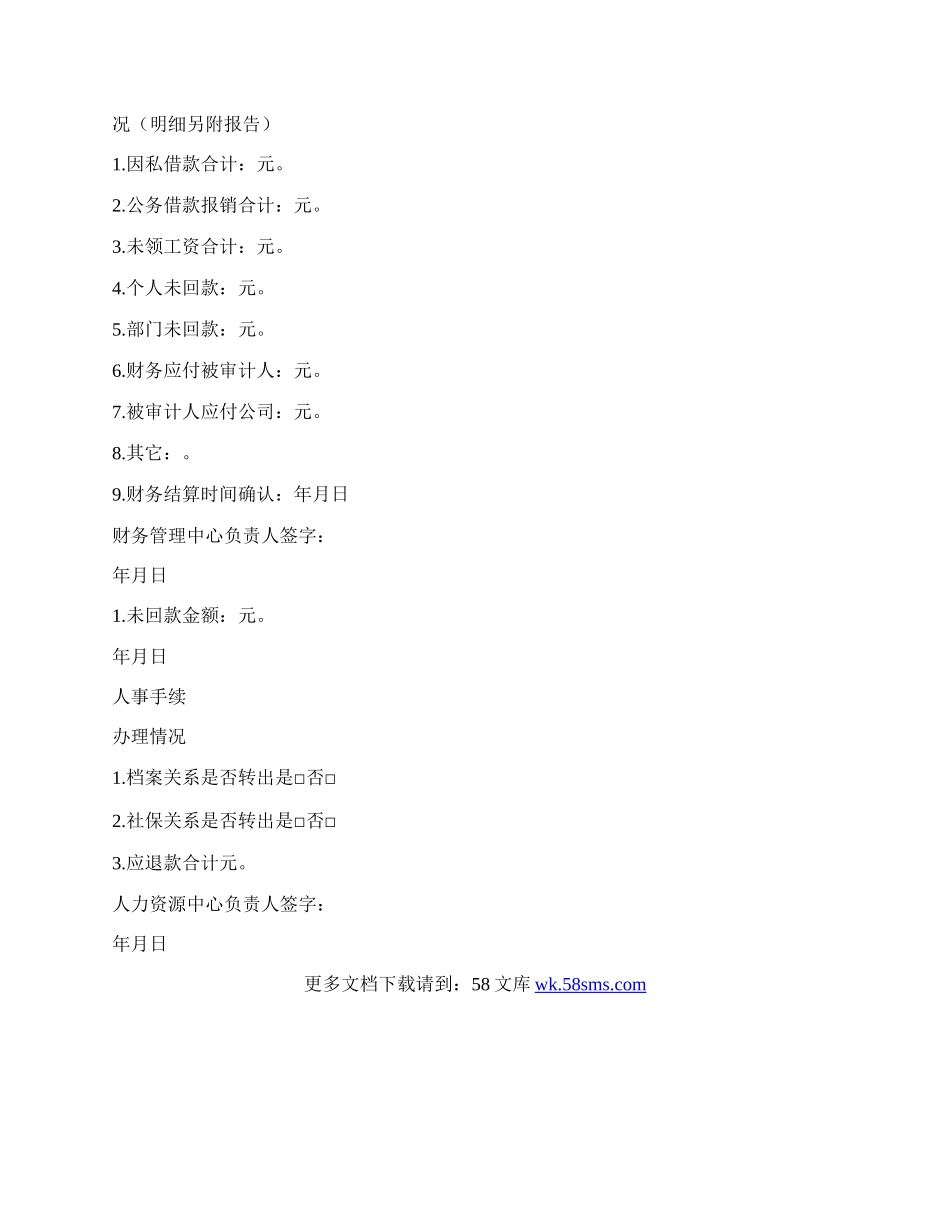 离任审计申请书文件、资料类上交情况(明细另附报告)1.经手的公司管理文件或部门文件、资料。已交□未交□2.个人/部门未回款统计已交□未交□3.在任职期间经手的财务单据和凭证。已交□未交□部门负责人签字:年...