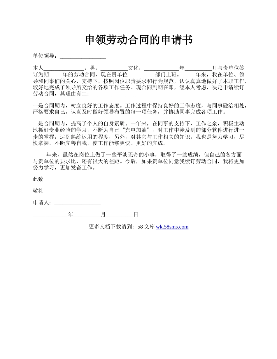 申领劳动合同的申请书单位领导:_________________本人_______________,男,__________文化,_____________年__________月与贵单位签订为期_____年的劳动合同,现在贵单位__________部门上班。_____年来,我在单...
