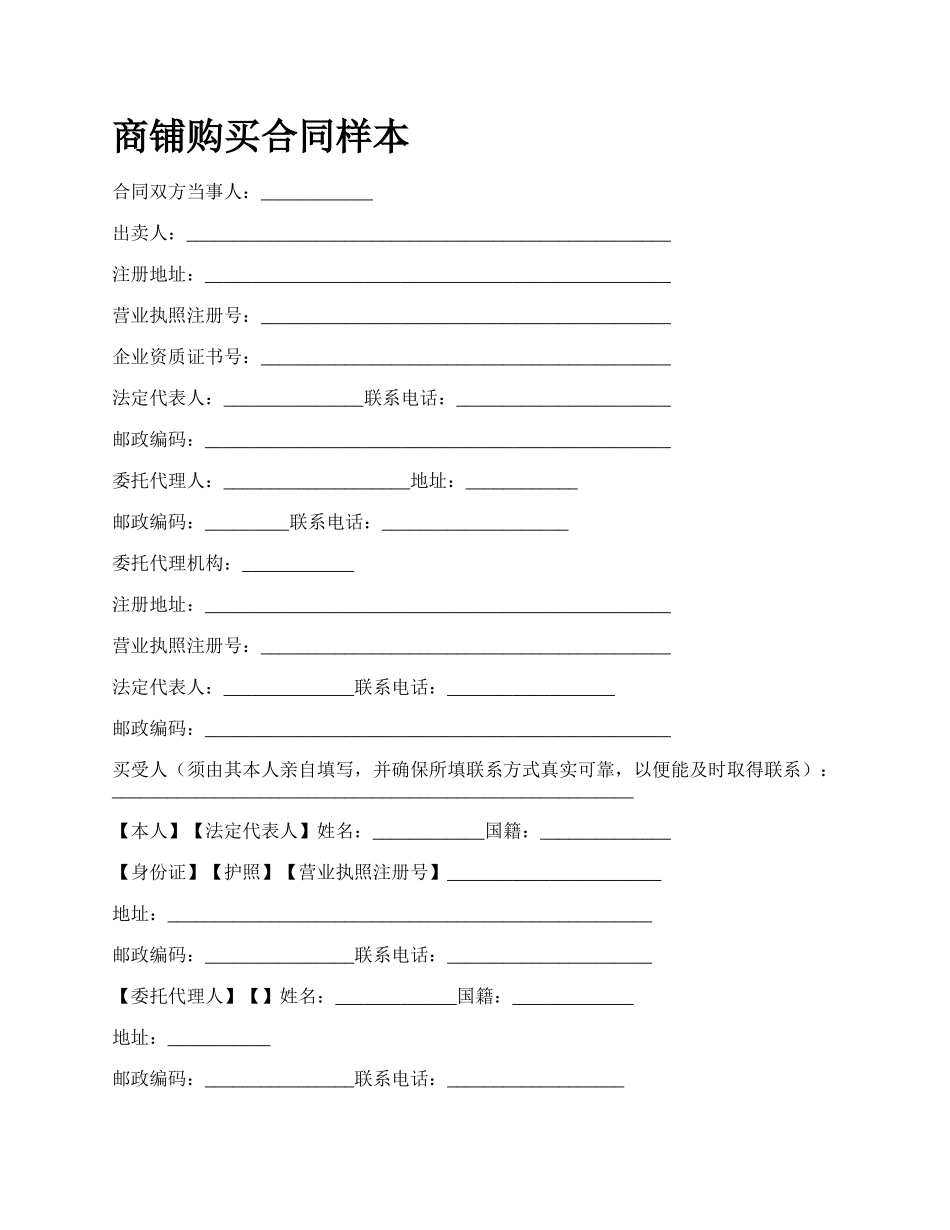 商铺购买合同样本合同双方当事人:____________出卖人:____________________________________________________注册地址:__________________________________________________营业执照注册号:_________________...