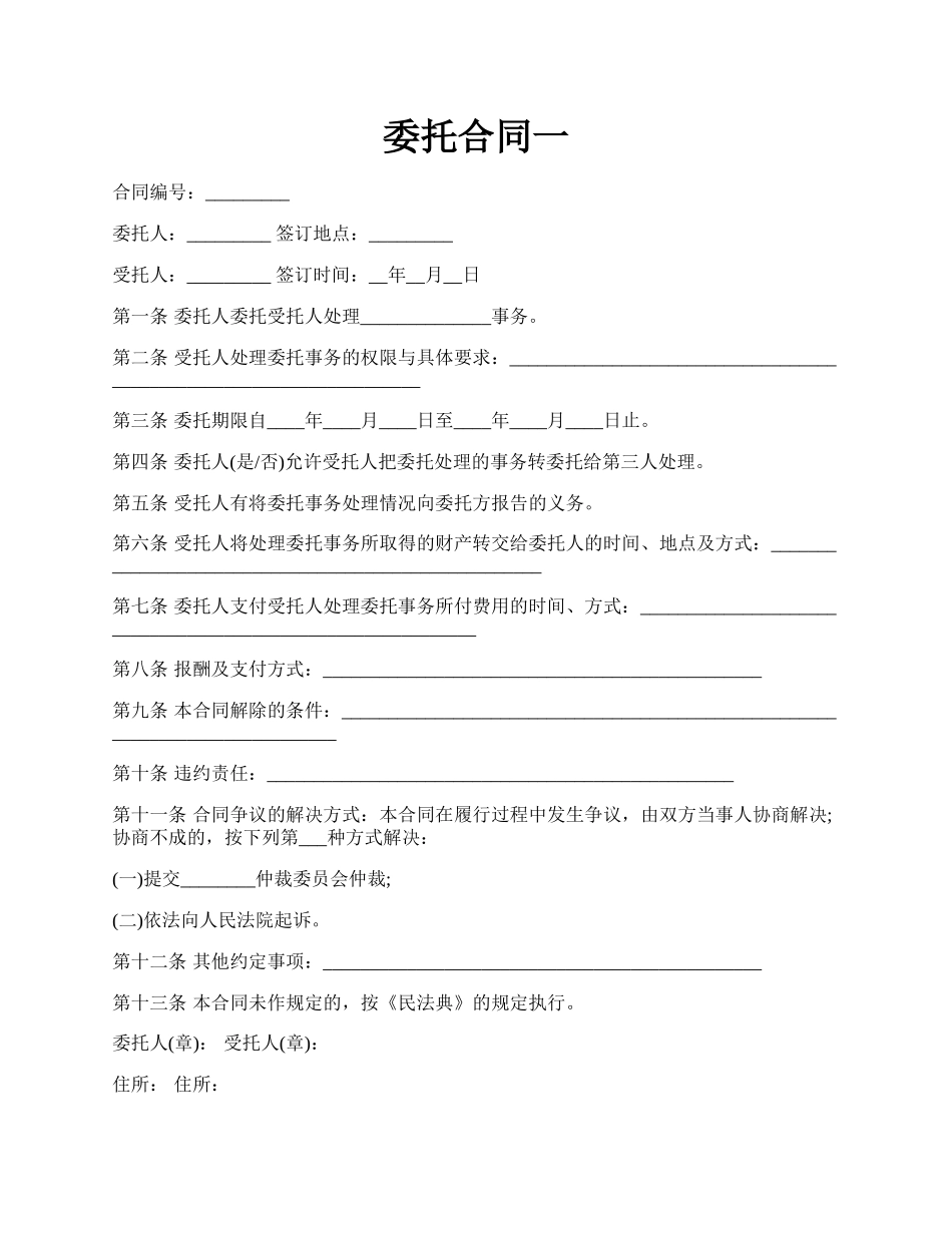 委托合同一合同编号:_________委托人:_________签订地点:_________受托人:_________签订时间:__年__月__日第一条委托人委托受托人处理______________事务。第二条受托人处理委托事务的权限与具体要求:_____...