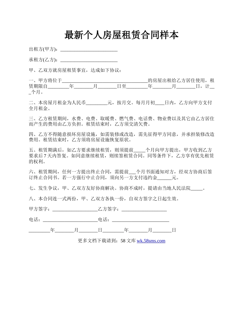 最新个人房屋租赁合同样本出租方(甲方):________________________承租方(乙方):________________________甲、乙双方就房屋租赁事宜,达成如下协议:一、甲方将位于____________________________________的房屋...