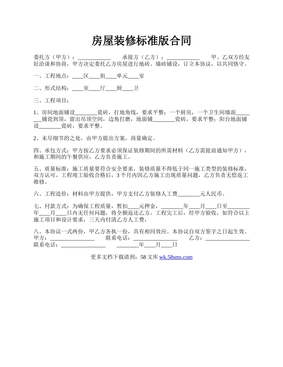 房屋装修标准版合同委托方(甲方):____________承接方(乙方):____________甲、乙双方经友好洽谈和协商,甲方决定委托乙方房屋进行地砖、墙砖铺设,订立本协议,以共同恪守。一、工程地点:____区____街____...