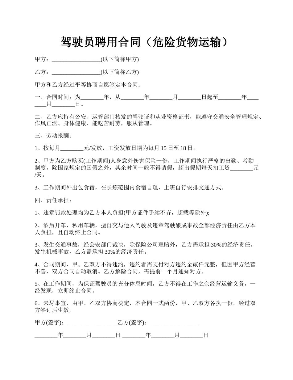 驾驶员聘用合同(危险货物运输)甲方:_________________(以下简称甲方)乙方:_________________(以下简称乙方)甲方和乙方经过平等协商自愿签定本合同:一、合同时间:为________年,从________年________月_____...