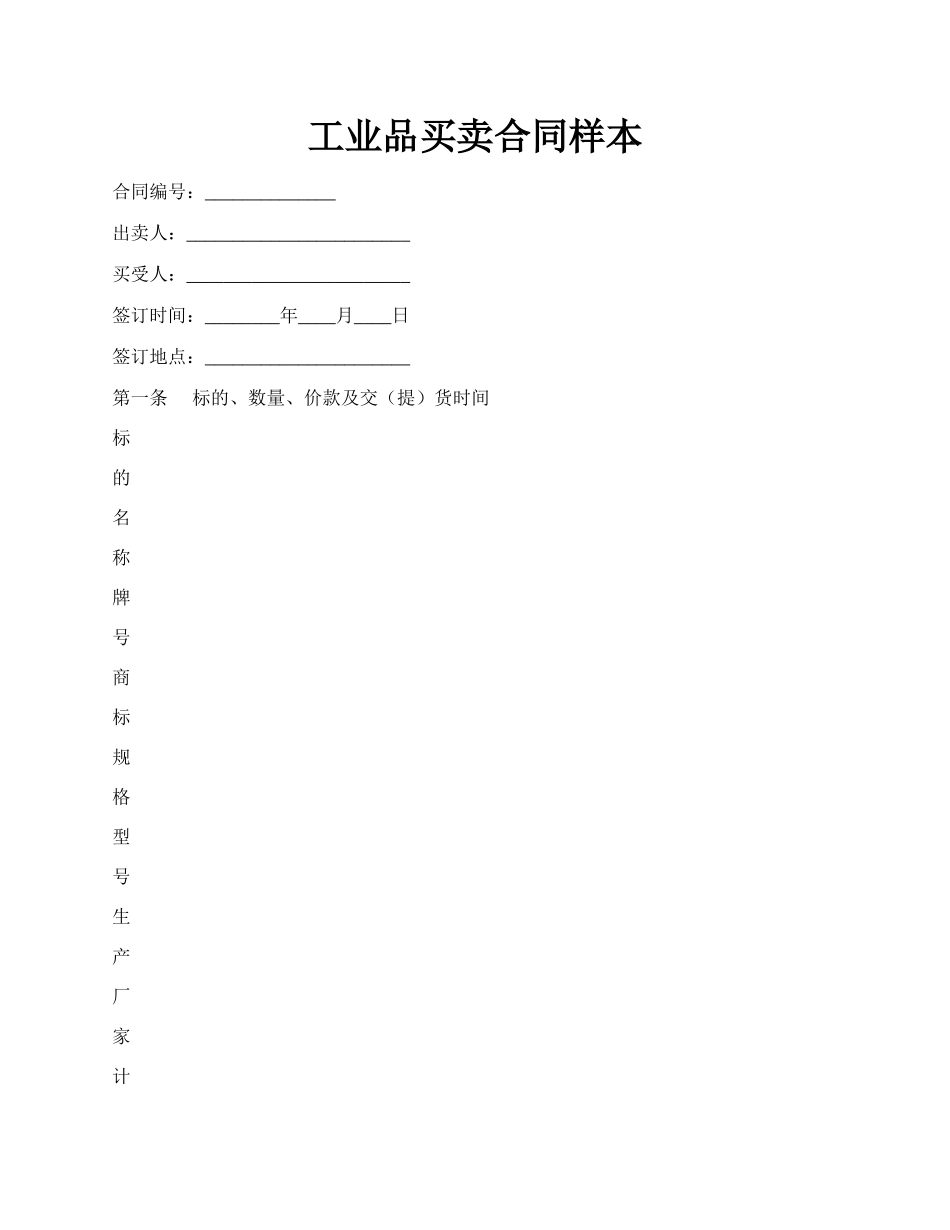 工业品买卖合同样本合同编号:______________出卖人:________________________买受人:________________________签订时间:________年____月____日签订地点:______________________第一条标的、数量、价款及交...