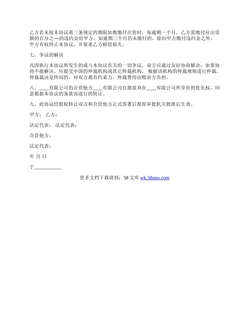 有限公司股权转让协议通用范本______有限公司股权转让协议(参考格式)签订协议双方:甲方:乙方:合营他方:________有限公司是由____和____共同投资兴办的中外合资(合作)经营企业。____有限公司的投资总额___...