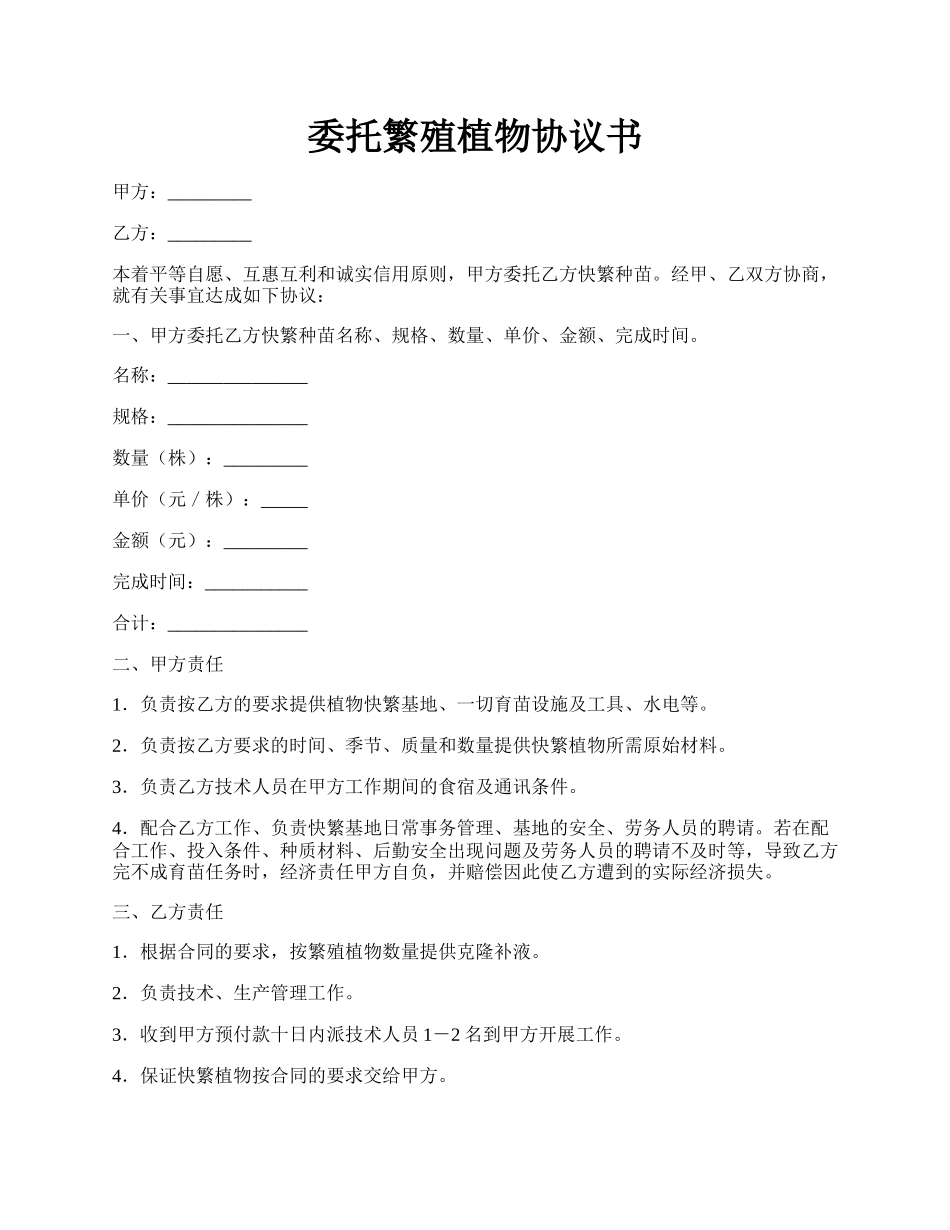 委托繁殖植物协议书甲方:_________乙方:_________本着平等自愿、互惠互利和诚实信用原则,甲方委托乙方快繁种苗。经甲、乙双方协商,就有关事宜达成如下协议:一、甲方委托乙方快繁种苗名称、规格、数量、单价...