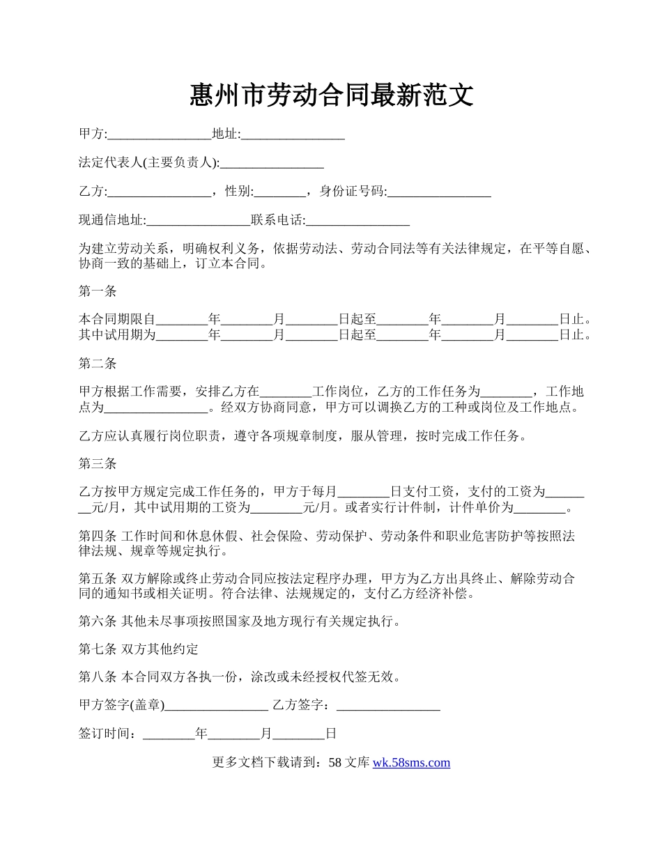 惠州市劳动合同最新范文甲方:________________地址:________________法定代表人(主要负责人):________________乙方:________________,性别:________,身份证号码:________________现通信地址:________________联...