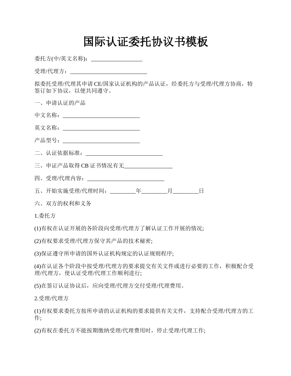 国际认证委托协议书模板委托方(中/英文名称):__________________受理/代理方:___________________________拟委托受理/代理其申请CE/国家认证机构的产品认证,经委托方与受理/代理方协商,特签订如下协议,以便...