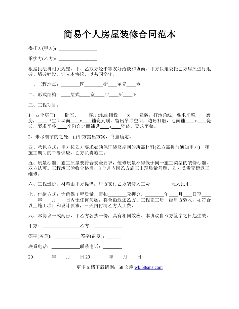 简易个人房屋装修合同范本.docx