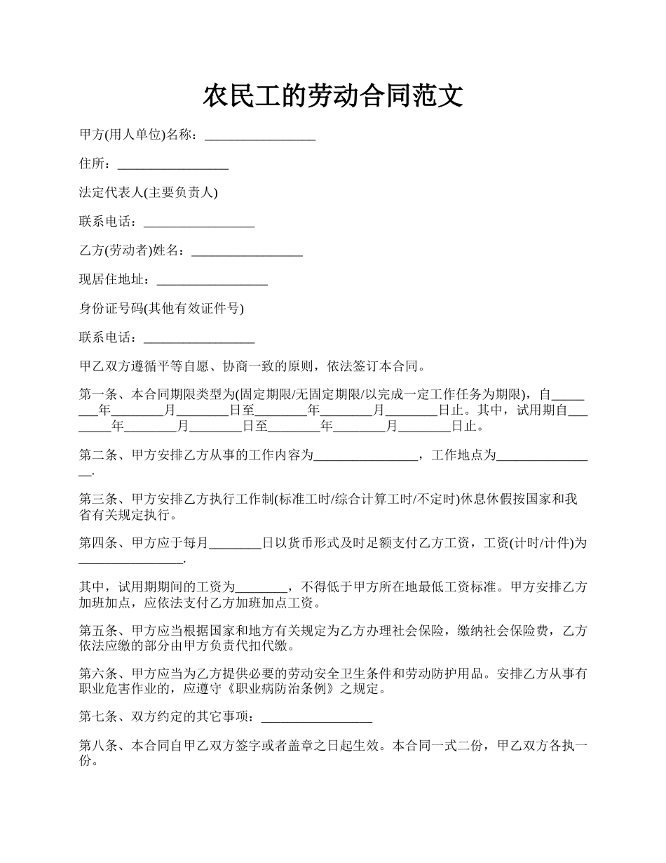 农民工的劳动合同范文甲方(用人单位)名称:_________________住所:_________________法定代表人(主要负责人)联系电话:_________________乙方(劳动者)姓名:_________________现居住地址:_________________身份...