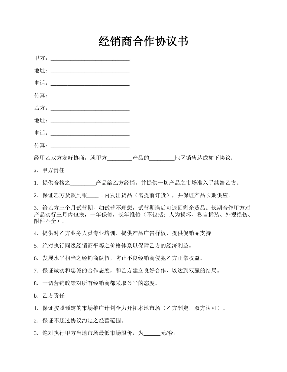 经销商合作协议书甲方:____________________________地址:____________________________电话:____________________________传真:____________________________乙方:____________________________地址:_____...