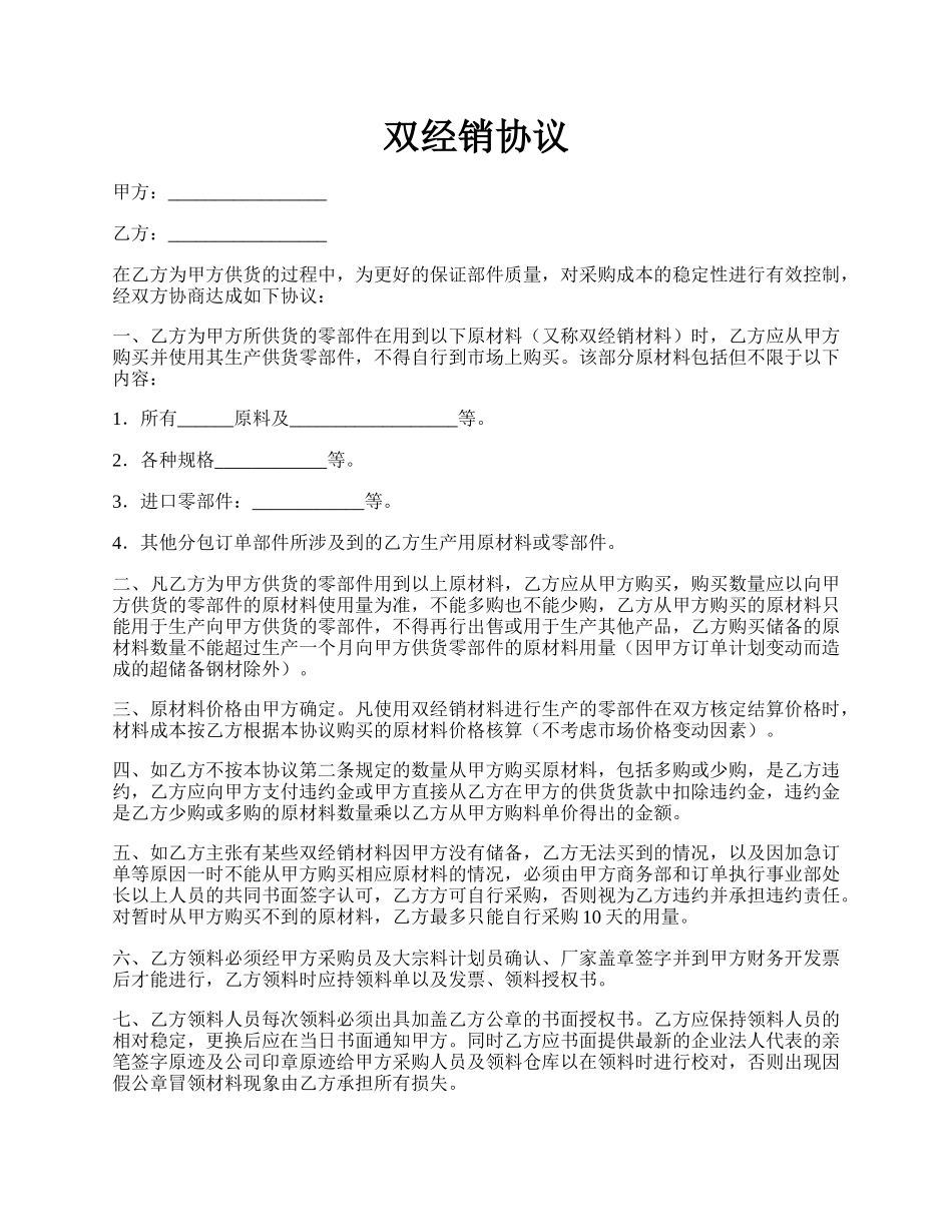 双经销协议甲方:_________________乙方:_________________在乙方为甲方供货的过程中,为更好的保证部件质量,对采购成本的稳定性进行有效控制,经双方协商达成如下协议:一、乙方为甲方所供货的零部件在用到以...