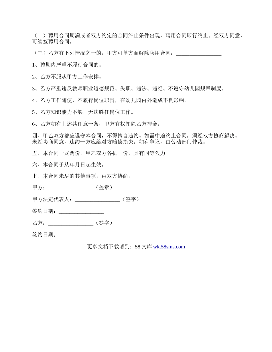 幼儿教师劳动合同模板甲方(聘用单位)法人代表(负责人)乙方(受聘教师)身份证号:_________________为了依法维护双方权益,明确义务,根据现行法律法规和有关政策规定,本着平等自愿、协商一致的原则,经甲乙...