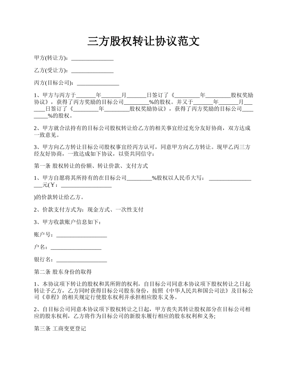 三方股权转让协议范文甲方(转让方):_______________乙方(受让方):_______________丙方(目标公司):_______________1、甲方与丙方于_______年_______月_______日签订了《_________年_________股权奖励协议》,获...