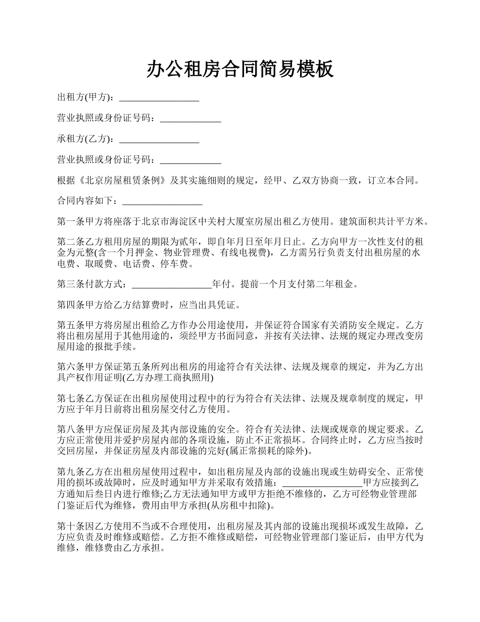 办公租房合同简易模板出租方(甲方):_________________营业执照或身份证号码:_____________承租方(乙方):_________________营业执照或身份证号码:_____________根据《北京房屋租赁条例》及其实施细则的规定,...