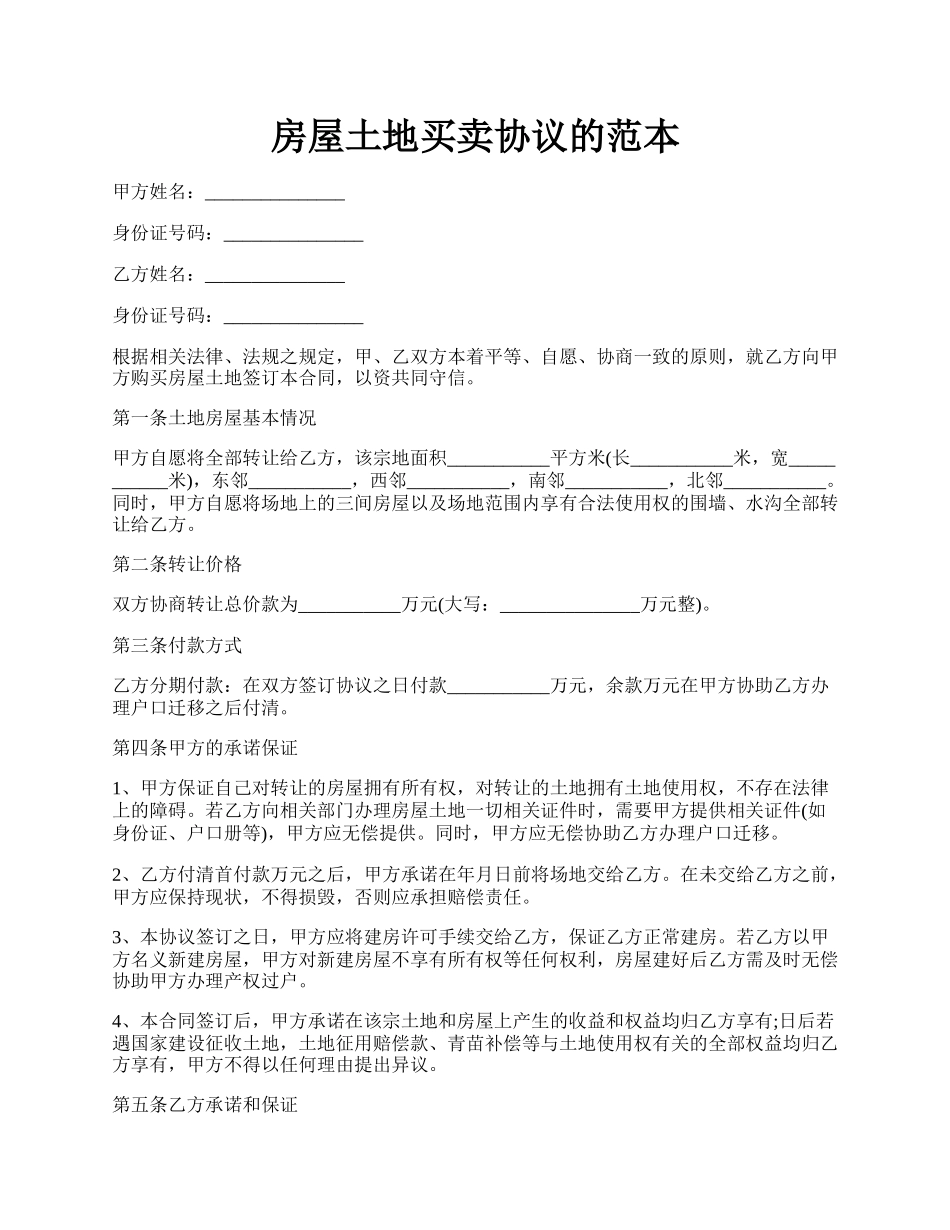 房屋土地买卖协议的范本甲方姓名:_______________身份证号码:_______________乙方姓名:_______________身份证号码:_______________根据相关法律、法规之规定,甲、乙双方本着平等、自愿、协商一致的原则,就...