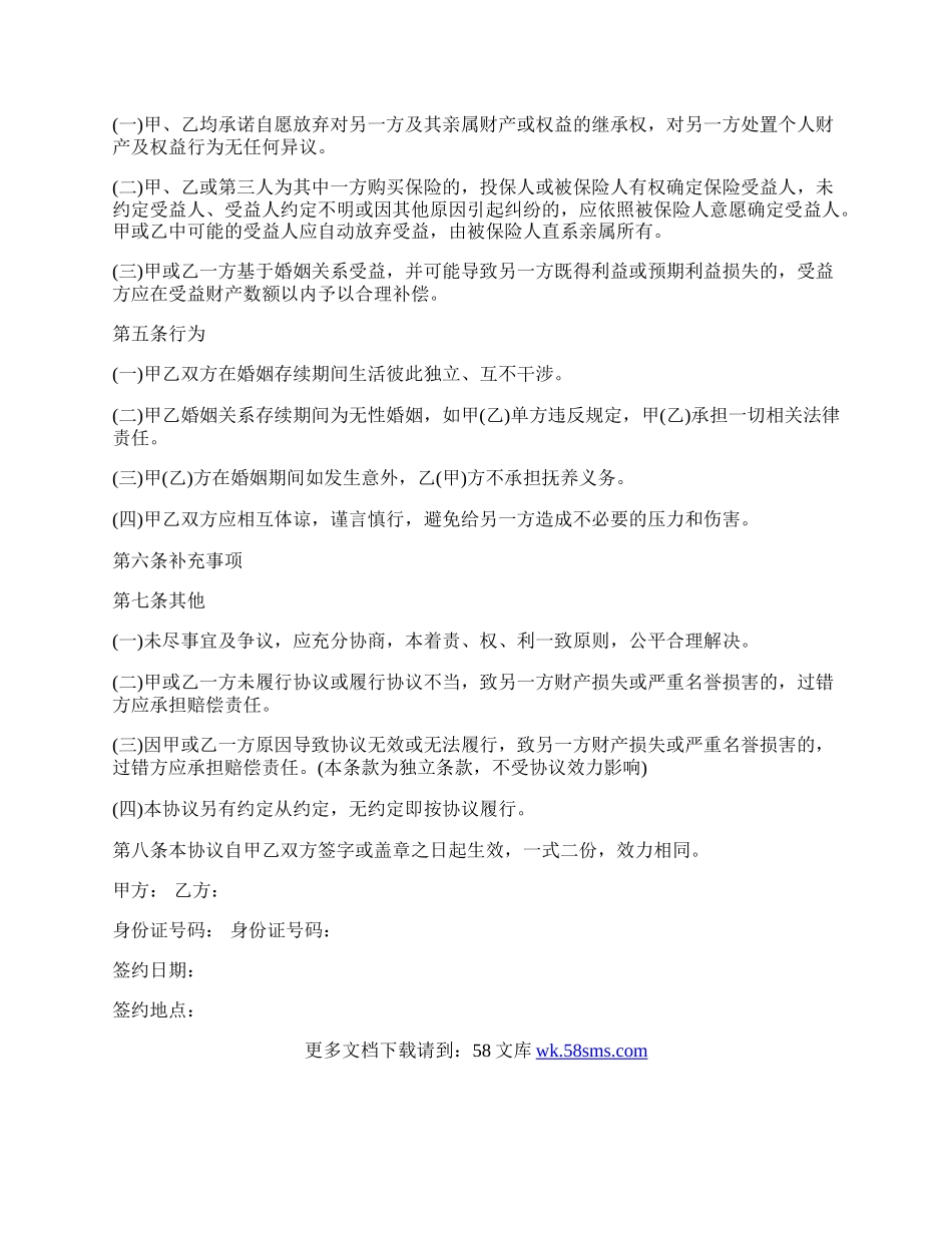 婚姻协议书甲方:乙方:根据国家有关法律法规,甲乙自愿结成婚姻关系,并就有关事宜协商一致,订立本协议。第一条财产(一)甲、乙所得财产均为个人财产,不得归为共同所有。个人财产包括婚姻关系存续期间所得工资...