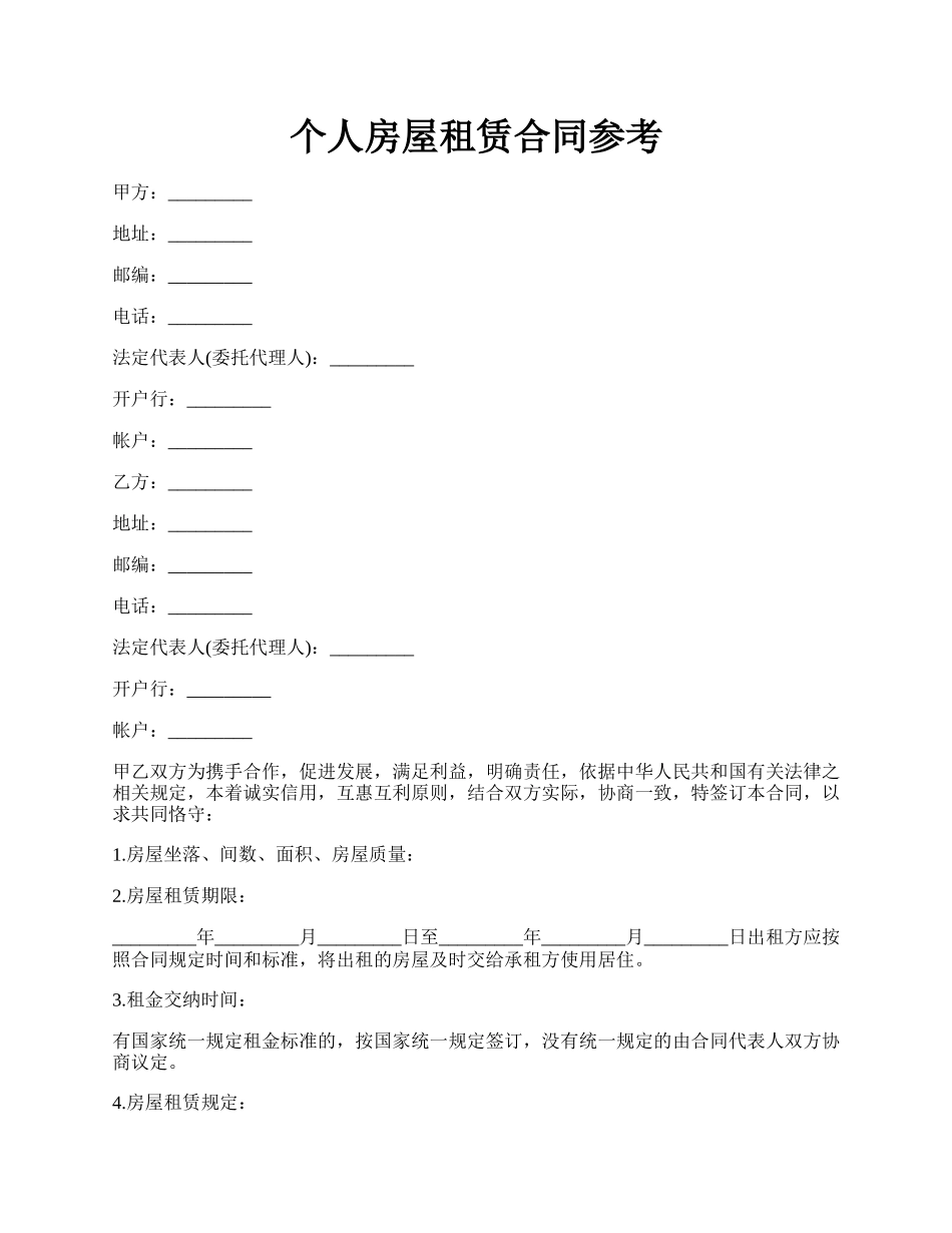 个人房屋租赁合同参考甲方:_________地址:_________邮编:_________电话:_________法定代表人(委托代理人):_________开户行:_________帐户:_________乙方:_________地址:_________邮编:_________电话:_...