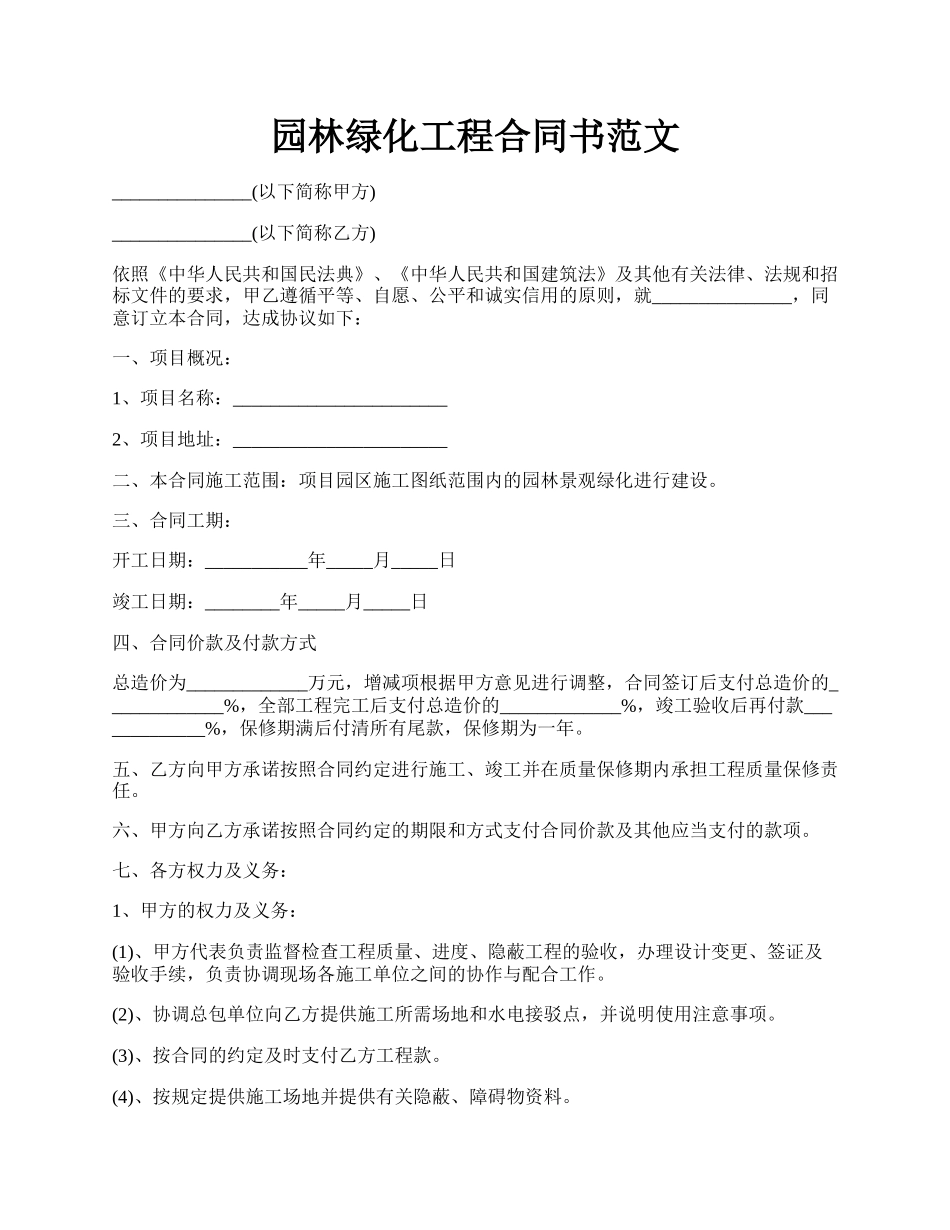 园林绿化工程合同书范文_______________(以下简称甲方)_______________(以下简称乙方)依照《中华人民共和国民法典》、《中华人民共和国建筑法》及其他有关法律、法规和招标文件的要求,甲乙遵循平等、自愿、公平...