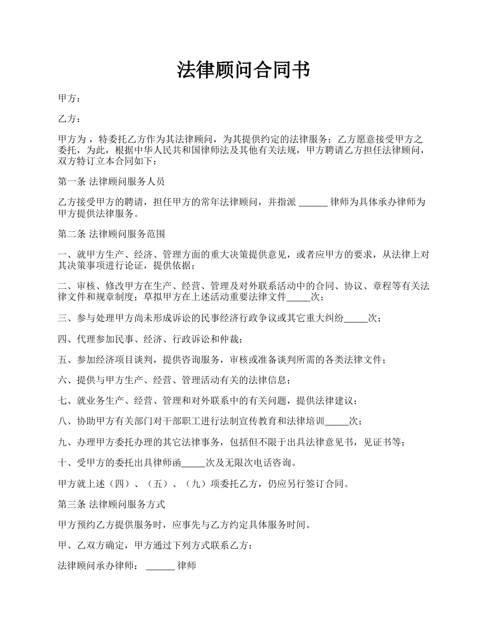 法律顾问合同书甲方:乙方:甲方为,特委托乙方作为其法律顾问,为其提供约定的法律服务;乙方愿意接受甲方之委托,为此,根据中华人民共和国律师法及其他有关法规,甲方聘请乙方担任法律顾问,双方特订立本合同...