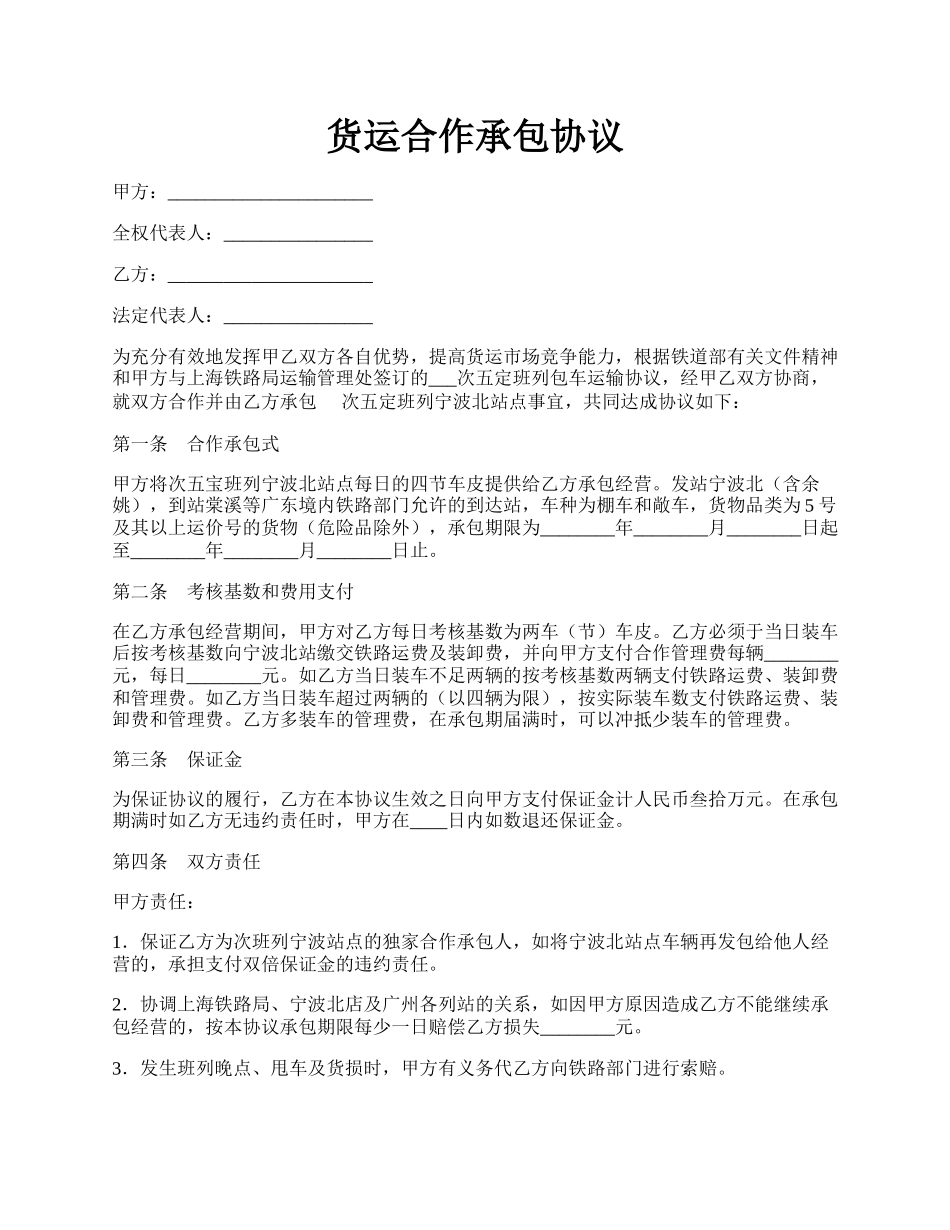 货运合作承包协议甲方:______________________全权代表人:________________乙方:______________________法定代表人:________________为充分有效地发挥甲乙双方各自优势,提高货运市场竞争能力,根据铁道部有...