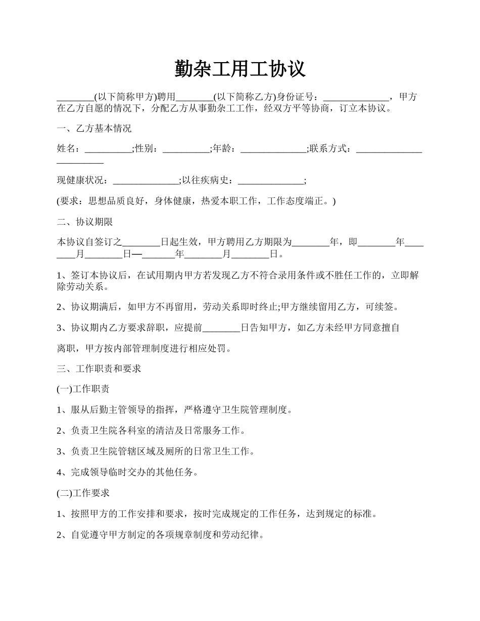 勤杂工用工协议________(以下简称甲方)聘用________(以下简称乙方)身份证号:______________,甲方在乙方自愿的情况下,分配乙方从事勤杂工工作,经双方平等协商,订立本协议。一、乙方基本情况姓名:__________;...