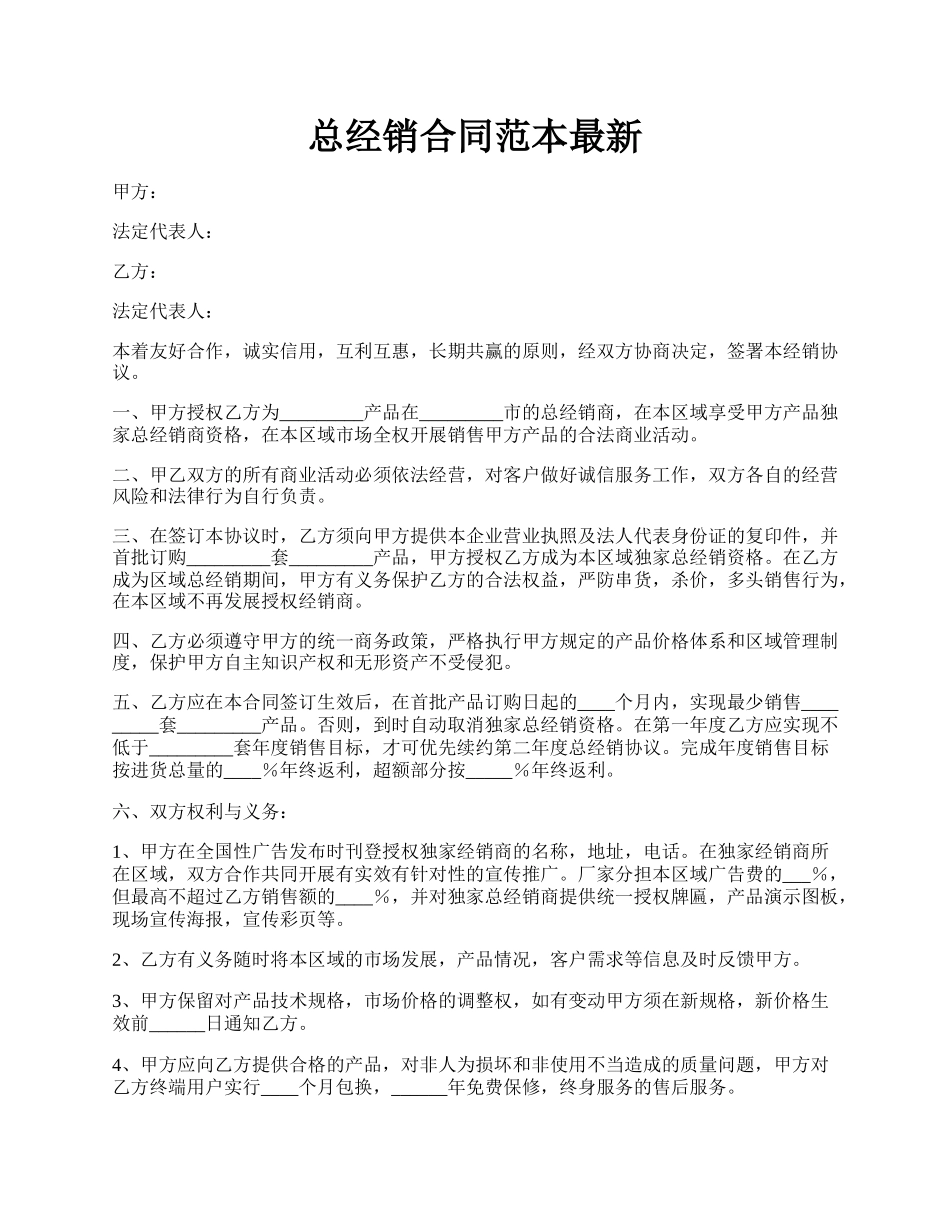 总经销合同范本最新甲方:法定代表人:乙方:法定代表人:本着友好合作,诚实信用,互利互惠,长期共赢的原则,经双方协商决定,签署本经销协议。一、甲方授权乙方为_________产品在_________市的总经销商,在本...
