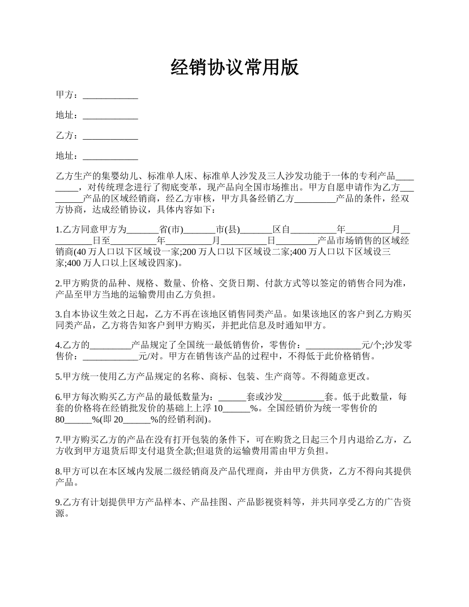 经销协议常用版甲方:____________地址:____________乙方:____________地址:____________乙方生产的集婴幼儿、标准单人床、标准单人沙发及三人沙发功能于一体的专利产品_________,对传统理念进行了彻底变革,...
