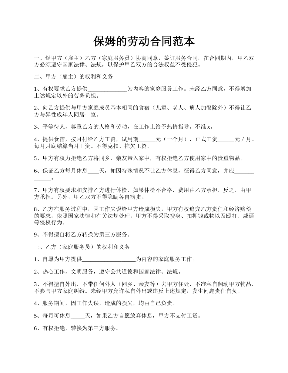 保姆的劳动合同范本.docx